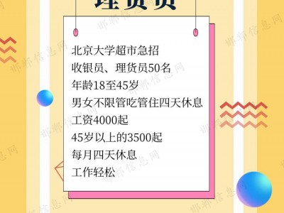招聘:北京大学超市急招收银员理货员50名,年龄18至45岁,男女不限管吃管住四天休息,工资4000起;45岁以上的3500起,每月四天休息,工作轻松。
