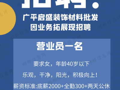 广平启盛装饰材料批发因业务拓展现招聘营业员一名,要求女,年龄40岁以下,乐观,干净,阳光,积极向上!薪资标准:底薪2000+全勤300+两天公休