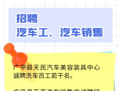 广平县天民汽车美容装具中心诚聘洗车员工若干名。
