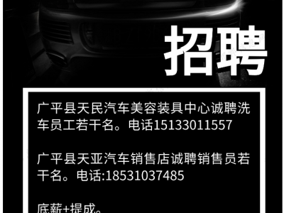 广平县天民汽车美容装具中心诚聘洗车员工若干名。冯经理:15133011557