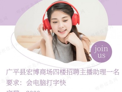 招聘主播助理要求打字快地址广平县宏博商城四楼月薪3000工作5个小时电话13323202057
