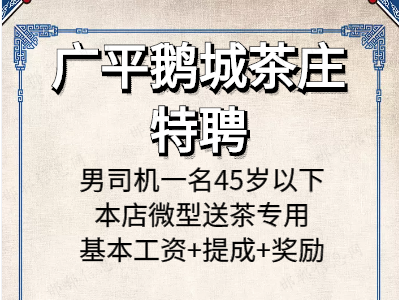 1.男司机一名45岁以下,本店微型车送茶专用,基本工资+提成+奖励;