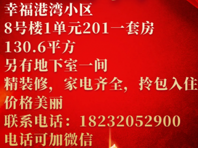 出售:幸福港湾小区8号楼1单元201一套房,130.6平方,另有地下室一间,精装修,家电齐全,拎包入住,价格美丽。联系电话:18232052900,电话可加微信。
