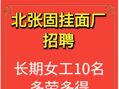 北张固挂面厂招聘:长期女工10名,责任心强,吃苦耐劳,计件工资,多劳多得,有经验者优先