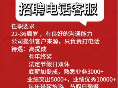 招聘:电话客服,22-36周岁,薪资:底薪加提成,熟悉业务3000+,业绩突出5000+,业绩优秀10000+,法定节假日双休,每年带薪旅游,节假日聚餐