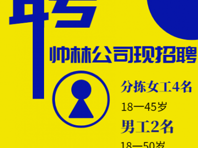 帅林公司现招分拣女工4名,18一45岁,男工2名,18一50岁,中午管饭,节假日发福利,工资待遇高,厂内环境好,流水线作业,地址清障村,电话13383007061,13730064459