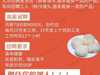 高薪诚聘:售货员/车间招聘工人,月薪7000到9000元,包吃住,工作时间12个小时,要求:身体健康,吃苦耐劳,踏实肯干,年龄30到50岁。电话13400306079工作地点:北京朝阳区