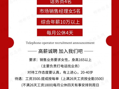 招聘:话务员4名,市场销售经理女5名