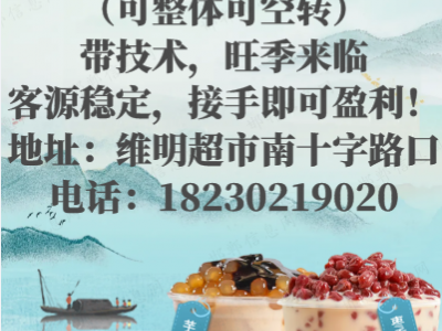因工作安排,现有奶茶店转让(可整体可空转)带技术,旺季来临,客源稳定,接手即可盈利!