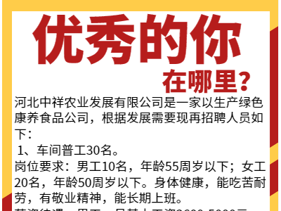 河北中祥农业发展有限公司是一家以生产绿色康养食品公司,根据发展需要现再招聘人员如下: