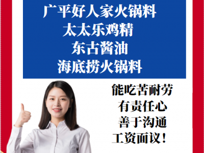 广平好人家火锅料,太太乐鸡精 ,东古酱油,海底捞火锅料,能吃苦耐劳,有责任心,善于沟通,工资面议!