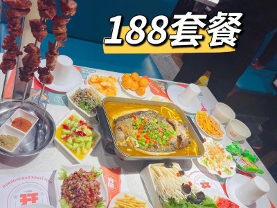88元烤鱼套餐(主食、小吃、凉菜、水果、饮料不限量) 128烤鱼套餐(油麦、豆皮各一份,主食、小吃、凉菜、水果饮料不限量) 188烤鱼套餐(皮蛋豆腐1份,怒拍前男友1份,大叉烤肉一份、蔬菜拼盘一份、主食、小吃、凉菜、水果、饮料不限量)