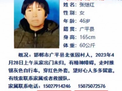 4月28号上午从家北张固出去一直没回来,失踪两天两夜,希望看见的亲朋好友告诉一下她的具体位置,联系电话..