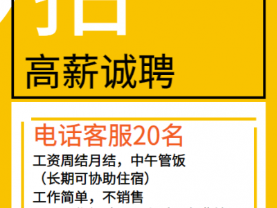 高薪诚聘:电话客服20名,工资周结月结,中午管饭(长期可协助住宿)工作简单,不销售,无需工作经验即可上手,免费培训,接收宝妈与实习生。联系 13230036263 17732015710(V信同号)