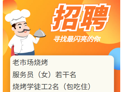老市场烧烤服务员(女)若干名,烧烤学徒工2名(包吃住)外派邯郸。