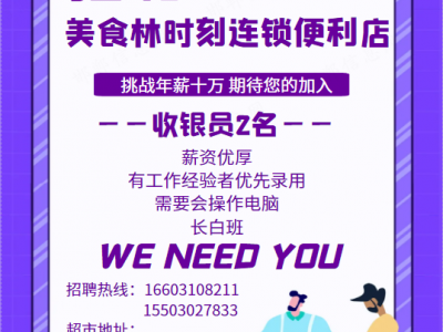 美食林时刻连锁便利店招聘收银员2名,薪资优厚,有工作经验者优先录用,需要会操作电脑,长白班。