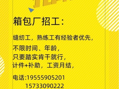 箱包厂招工: 因加工厂扩展现大量招聘,缝纫工,熟练工有经验者优先, 不限时间、年龄,只要踏实肯干就行, 计件+补助,工资月结, 地址:广平县城焦庄奶站旁边胡同东头路北。