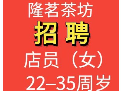 隆茗茶坊招聘店员,要求:女,22–35周岁,工资待遇,2000-3000(公休两天)