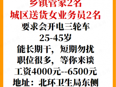 伊利代理商招聘乡镇管家2名,城区送货女业务员2名,要求会开电三轮车,25-45岁,能长期干,短期勿扰,职位很多,等你来谈,工资4000元--6500元,地址:北环卫生局东侧