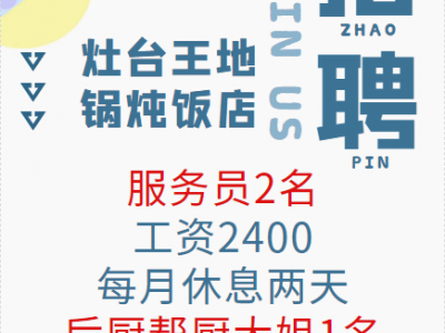 招聘:灶台王地锅炖饭店招聘服务员2名,工资2400每月休息两天,后厨帮厨大姐1名