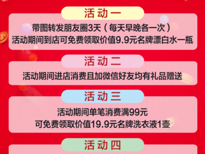 活动1⃣️:加微信带图转发朋友圈连续3天(每天早晚各一次)活动期间到店免费领取价值9.9元漂白水一瓶!