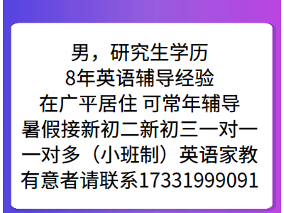 男,研究生学历,8年英语辅导经验,在广平居住,可常年辅导。暑假接新初二新初三一对一、一对多(小班制)英语家教,有意者请联系