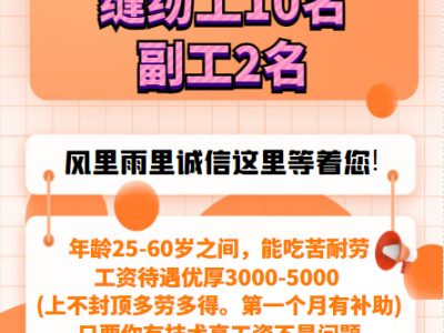 招聘:缝纫工10名,副工2名,年龄25-60岁之间,工资待遇优厚3000~5000元上不封顶,多劳多得,第一个月有补助,节假日有福利,常年有活。