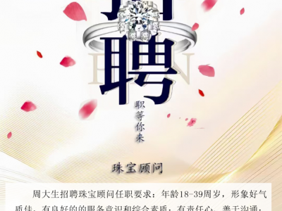 周大生招聘珠宝顾问任职要求:年龄18-39周岁,形象好气质佳,有良好的的服务意识和综合素质;有责任心、善于沟通;有珠宝销售经验者优先。薪资待遇:底薪2400+业绩提成,任务奖金,员工福利(上不封顶)月公休2天