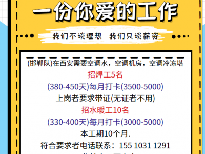 本水电队招工,(邯郸队)在西安需要空调水,空调机房,空调冷冻塔,招焊工5名(380--450天)每月打卡(3500---5000)上岗者要求带证(无证者不用)!需要10名水暖工(330--400天)每月打卡(3000--5000)!本工期10个月.符合要求者电话联系!工作地点:西安市