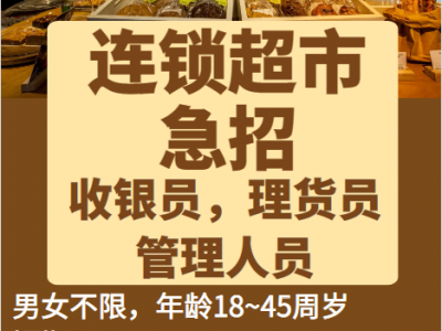 连锁超市急招:收银员,理货员,管理人员,男女不限,短期工不用,18~45周岁,工资4000起步,上不封顶,包吃包住,月休四天,工作轻松