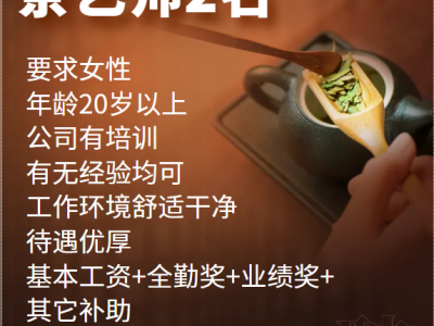 广平八马茶业招聘茶艺师2名,女性,20岁以上,有无经验均可,公司有培训。环境舒适干净,待遇优厚,基本工资+全勤奖+业绩奖+其它补助,电话,15100002217,2528558