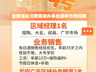 舍得酒业沱牌冀南办事处邯郸市场招聘:区域经理、业务销售:有经验者优先,35岁之内,年薪10万+保险福利+节假日休息+补助;广平区域业务精英,3000元底薪+2000元绩效,