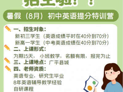暑假(8月)初中英语提分特训营,为期15天, 小班教学。英语专业,研究生毕业,8年英语辅导教学经验,自研课程,专业英语提分