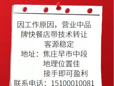快餐店转让:因工作原因,营业中品牌快餐店带技术转让,客源稳定