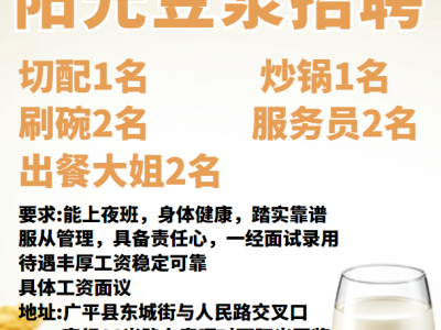 广平阳光豆浆招聘:刷碗,服务员,收银员,切配,出餐大姐,后厨杂工 能上夜班,身体健康,一经录用,待遇丰厚工,工资面议