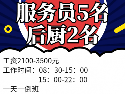 佳佳基招聘:服务员5名,后厨2名。工资2100-3500元,一天一倒班,有工作经验者优先录用