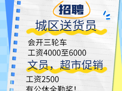 城区送货员,会开三轮车,工资4000至6000。文员,超市促销,工资2500。有公休全勤奖!待遇优厚!短期勿扰!