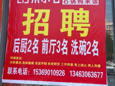 广平宋小七石锅鸡米饭招聘:前台2名、服务员6名、后厨3名、配餐3名。地址:联华超市北20米路东,联系电话:·