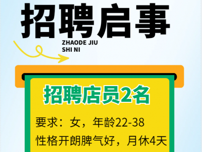 广平县城,招聘店员2名,要求:女,年龄22-38,性格开朗脾气好,月休4天,保底工资2000+提成,地址:广平县幸福港湾小区东门南50米天漠拖舟体验店。