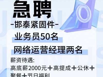 邯泰紧固件高薪急聘:业务员50名,网络运营经理两名。综合薪资资3000-5000,公休➕聚餐➕节日福利