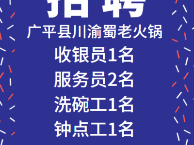 广平县川渝蜀老火锅招聘:收银员1名,服务员2名,洗碗工1名,钟点工1名。