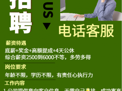 招聘电话客服,每天8小时公休4天,有各种福利,综合薪资2500-6000不等,纯办公室办公,公司提供资源,微信同号13931032327王经理13931044928广平县职教中心北校区西行80米路北