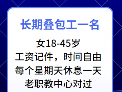 急招一名长期叠包工,女18-45岁,工资记件,时间自由,每个星期天休息一天,地址:老职教中心对过,过道里面。