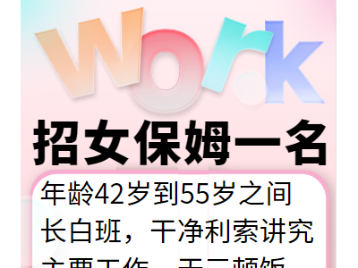 招女保姆一名,年龄42岁到55岁之间,长白班,干净利索讲究,主要工作一天三顿饭做做家务。工资2300,4天公休