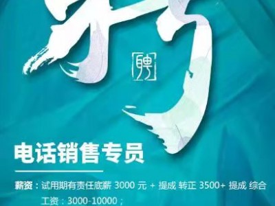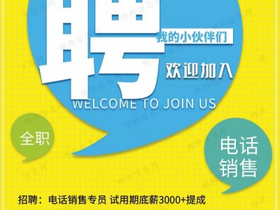 招聘:电话销售专员 试用期底薪3000+提成 转正3500+提成 综合工资3500-10000,不招学生 短期工