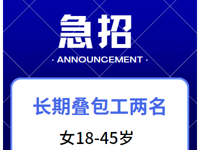 急招两名长期叠包工,女18-45岁,工资记件,时间自由,每个星期天休息一天,地址:老职教中心对过,过道里面。