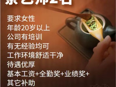 广平八马茶业招聘茶艺师2名,女性,20岁以上,有无经验均可,公司有培训。环境舒适干净,待遇优厚,基本工资+全勤奖+业绩奖+其它补助,电话15100002217,2528558