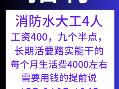北京工地需要招聘消防水大工4人,工资400,九个半点,长期活,要踏实能干的,每个月生活费4000左右,需要用钱的提前说,