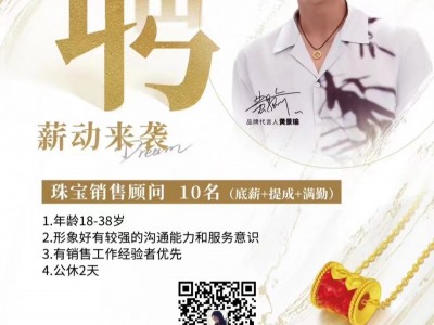 招聘店长1名,珠宝导购10名,底薪➕提成➕满勤,上不封顶,公休2天,分早晚班,心有多大,舞台就有多大,欢迎您的加入,