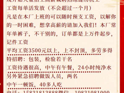 因工厂扩建,订单增加,腾飞制衣急聘:熟练缝纫机工50名,付工20名,月均3500以上,记件工资多劳多得。急招后道检验,待遇丰厚。有免费午餐纯净水,车间中央空调全天开放。电微15831813888(微信),19831081000